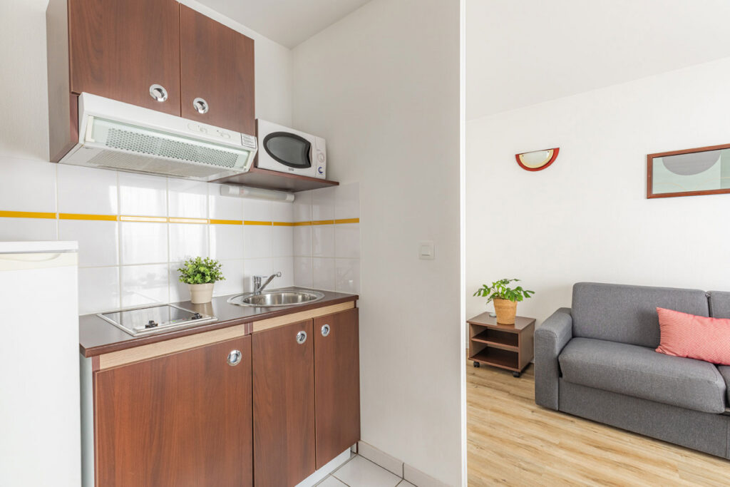 🔪 Une kitchenette entièrement équipée est également à votre disposition dans chaque appartement. Micro-ondes, bouilloire et machine à café Malongo…