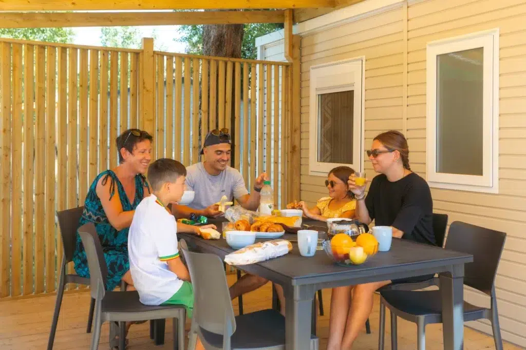 - 🏕️Mobil homes tout confort, équipés pour 1 à 8 personnes : séjour avec coin cuisine, chambres séparées, salle de bain avec douche et toilettes séparés, terrasse avec mobilier de jardin.