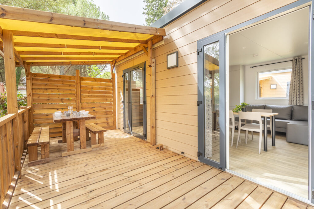 - 🏡Cottage en bois (4 personnes) : on adore son séjour dont les baies vitrées s’ouvrent entièrement sur la terrasse pour allier nature et confort