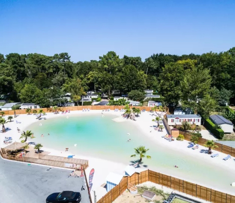 Le Camping La Clairière vous invite à découvrir son splendide lagon tropical artificiel de 1 300 m², avec une plage de sable blanc, des parasols paillote, des palmiers, et un bar à cocktails pour un dépaysement total.