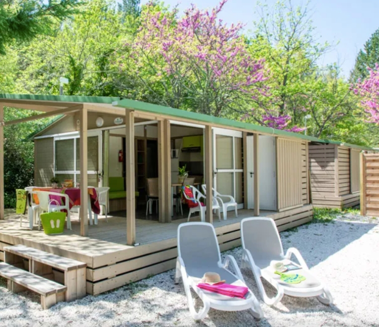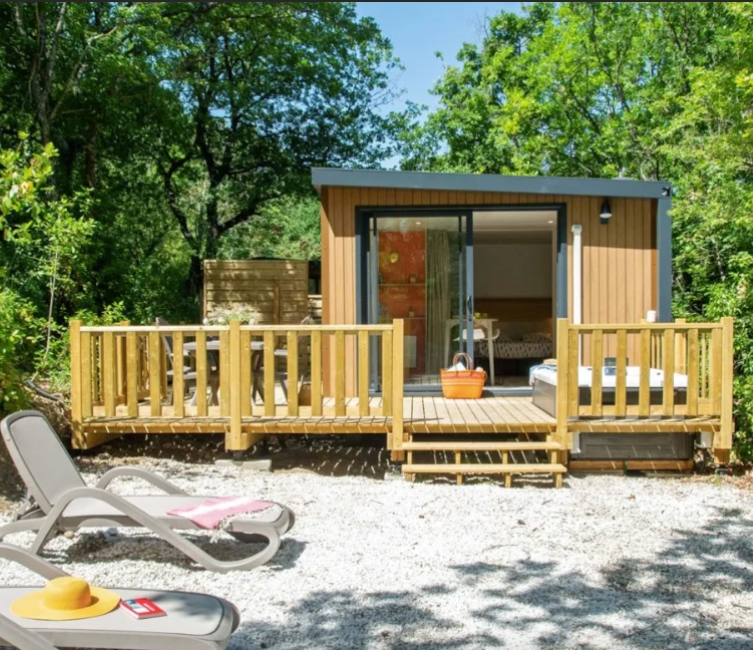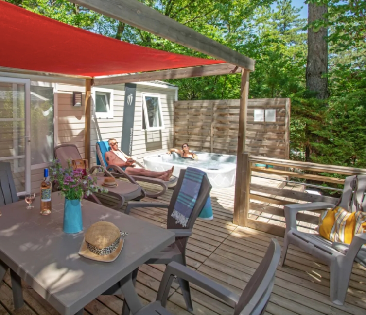 🏡 des mobil-homes climatisés pour 2 à 6 personnes (une à trois chambres) avec ou sans jacuzzi privatif ;