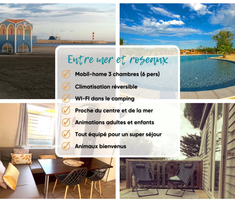 Partez en vacances dans le sud de la France. ☀️ Nous vous proposons la location de notre Mobil Home Entre Mer et Roseaux situé dans un camping à Port-la-Nouvelle, dans l’Aude, en Occitanie. 🏕️