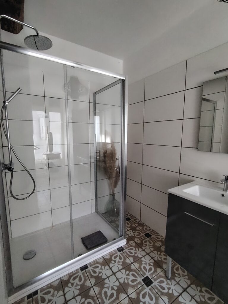 Elle est située en rez-de-chaussée (sans escaliers mais non adaptée PMR) et donne sur la véranda avec accès direct au jardin.