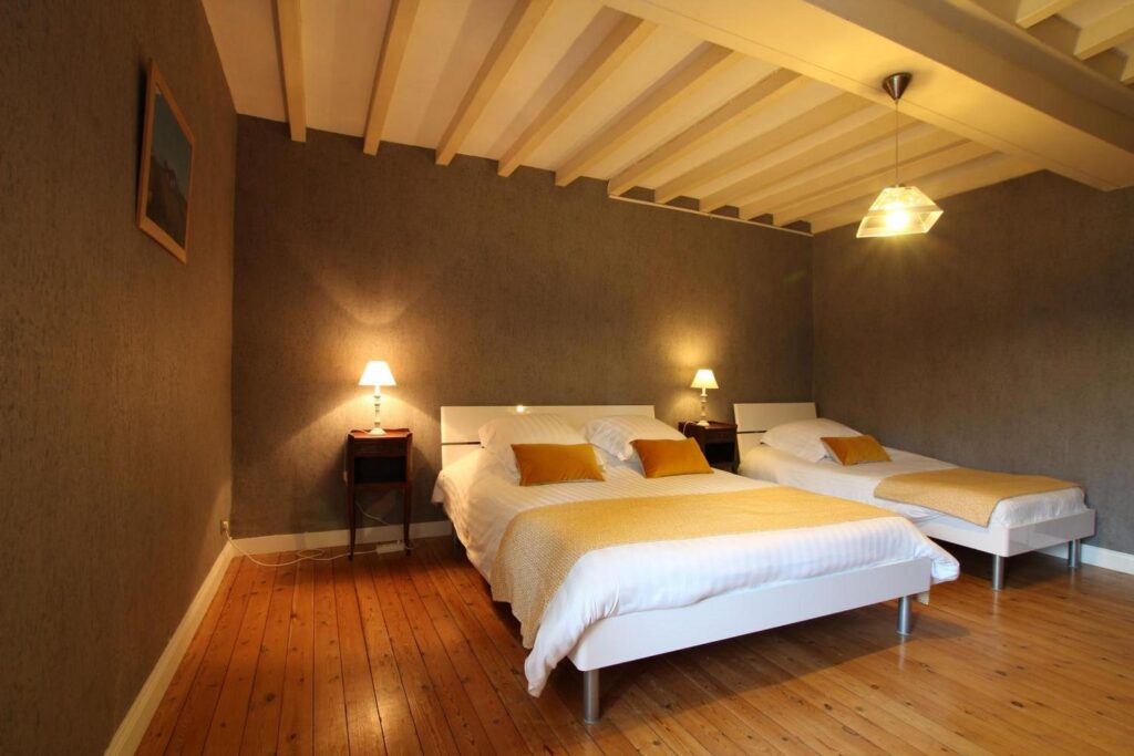 🛌🏽À l’étage, 2 chambres, 1 avec lit double, l’autre avec lit double et lit simple ainsi qu’une salle de bain avec baignoire et WC. Lave-linge à disposition.