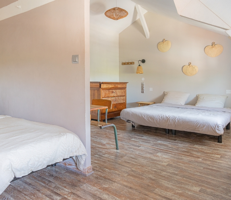 - 🛌7 chambres pour 15 personnes avec la possibilité de réserver un appartement attenant pour 2 à 3 personnes ainsi que le gîte Divin juste à côté pour 8 personnes (capacité totale du lieu : 26 personnes)