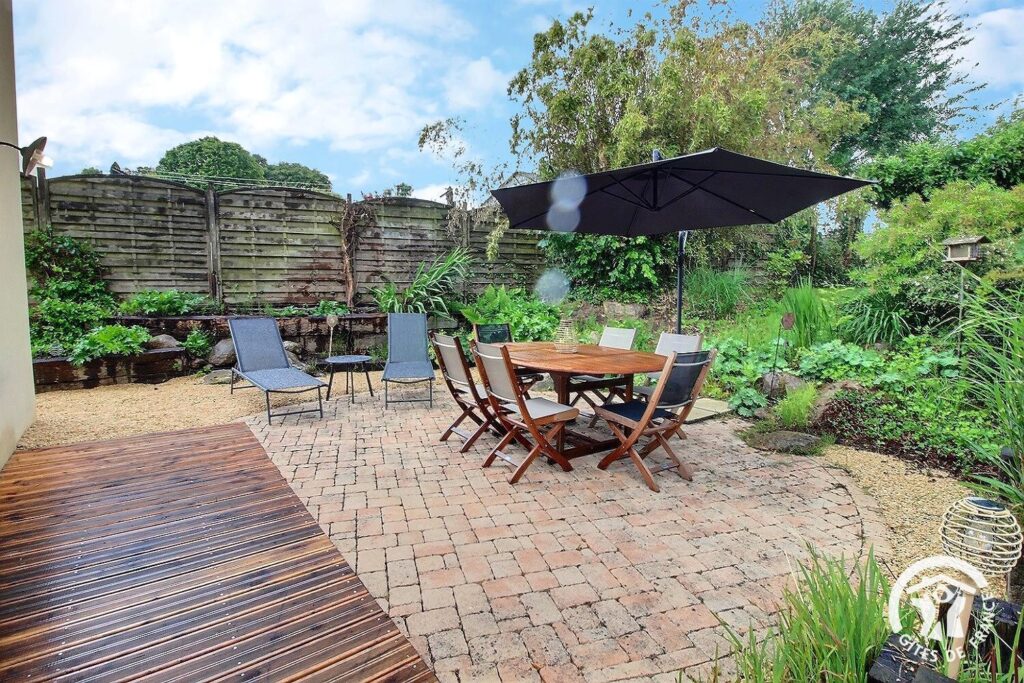 - Terrasse en bois avec salon de jardin pour les repas et moments de détente au soleil
