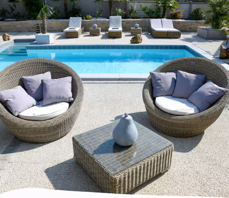 🌿 une jolie terrasse abritée avec salon de jardin et vue piscine.
