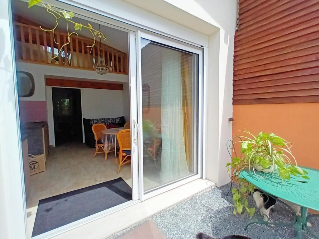 Tu trouveras dès ton arrivée, une terrasse avec vue sur le jardin et un bar à toutou ; D’ailleurs ta terrasse est sécurisée avec un portillon, en plus, elle est couverte s’il pleut.