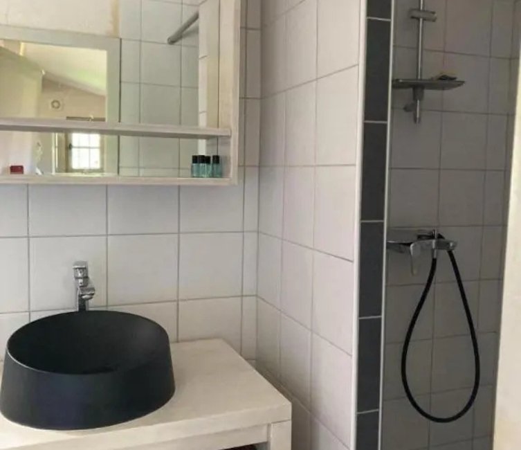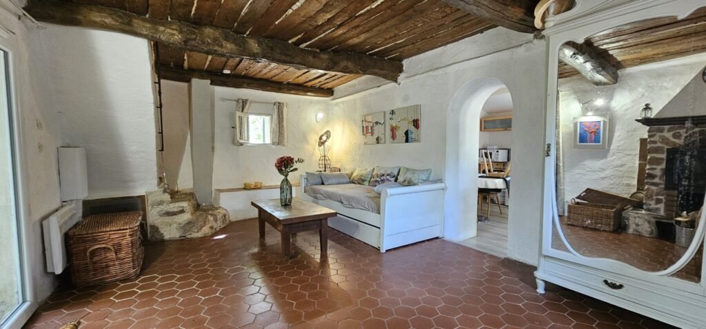 A l’intérieur, le séjour se compose d’un canapé lit et cheminée, séparé de la cuisine aménagée par un petit porche. Vous accédez à la salle d’eau (WC et douche italienne) par la cuisine.