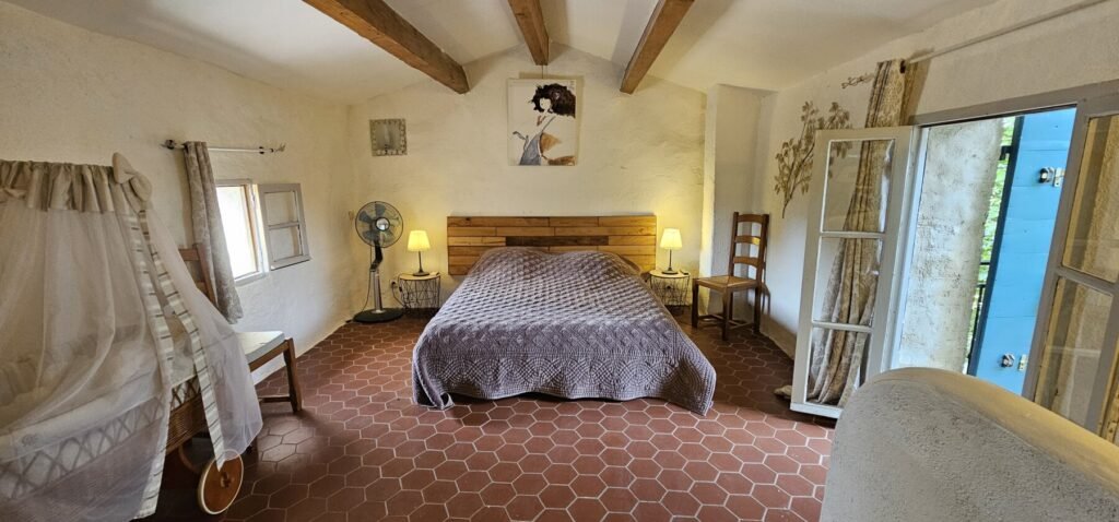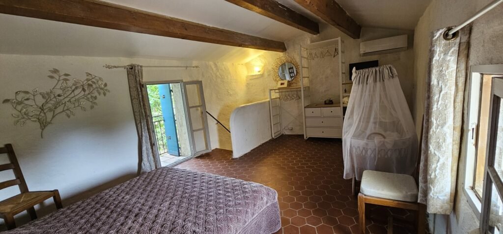 A l’étage se trouve le lit en 160 et dressing avec un joli balconnet « Roméo et Juliette » donnant sur le jardin. L’escalier en pierre pour accéder à l’étage est irrégulier, il peut être difficile selon la mobilité.