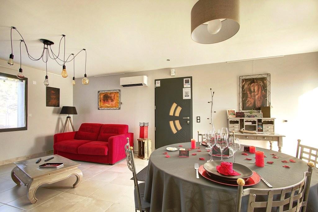 Notre capacité d’accueil est de 4 personnes avec un lit king-size (180×200) dans la chambre et un canapé convertible (matelas Dunlopillo 140×190) dans le salon.