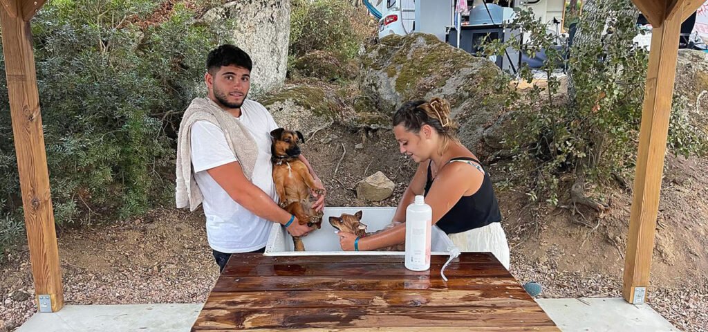 Après une journée de farniente ou d’activités sur les plages à proximité du village, comme la plage de Santa Giulia, de Figa, ou de Pinarello (toutes dog friendly), une canidouche dédiée vous permettra de laver confortablement votre loulou. Un toutoubar situé dans l’espace détente, est également disponible..